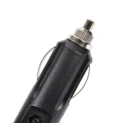 The plug features a standard male cigarette lighter connector with a spring-loaded center contact and a cylindrical shell, adhering to the ANSI/SAE J563 specification, where the center pin is the positive terminal (+12V) and the shell is the negative terminal (0V).