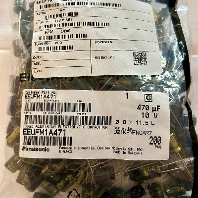 This pack includes six Panasonic FM Series 470µF 10V Electrolytic Capacitors. With low ESR, high ripple current capacity (approx. 900mA), and a lifespan of up to 5000 hours at 105°C, these 8–11.5x12mm radial capacitors are designed for filtering, decoupling, audio, and LED applications in 3.3V–9V systems. Pacific Custom Engineering provides authentic Panasonic components for repair or circuit use.